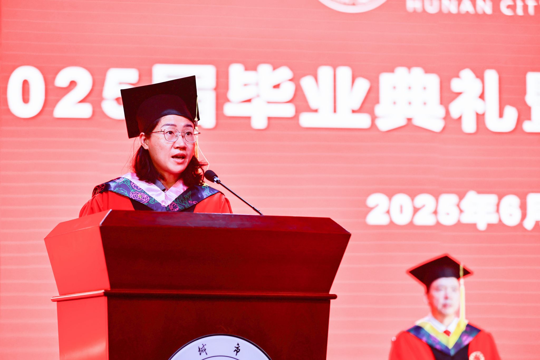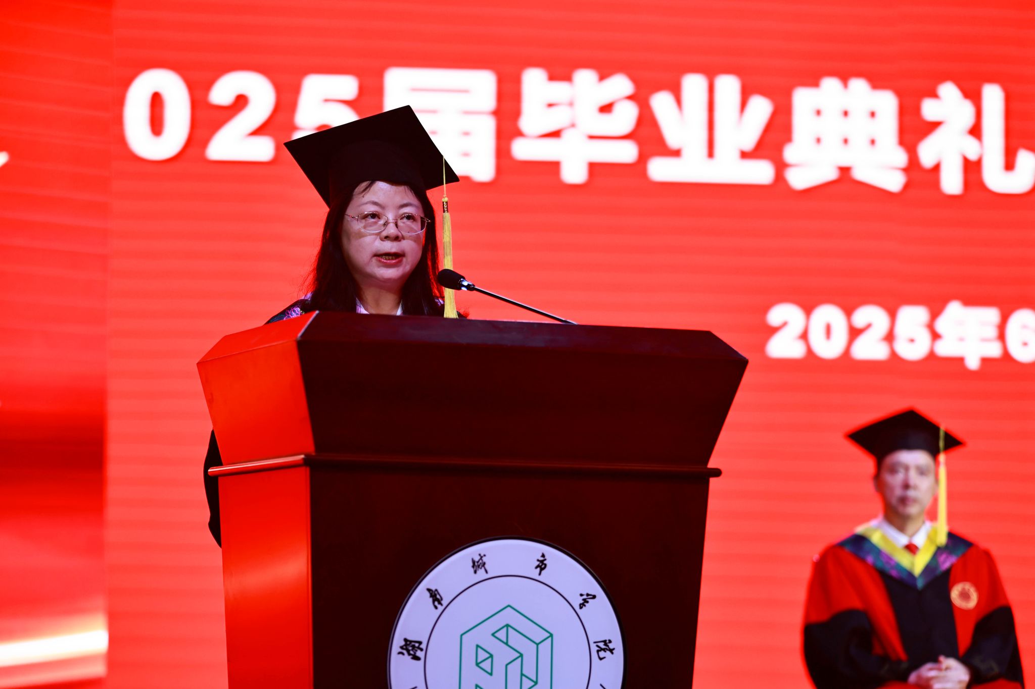副校长孙倩宣读了关于我校与南华大学联合培养的2025届研究生硕士学位的决议,授予李婷婷等10名同学硕士学位;副校长徐姝宣读关于授予2025届本科生学士学位的决议,授予卢佳星等6385名同学学士学位。
