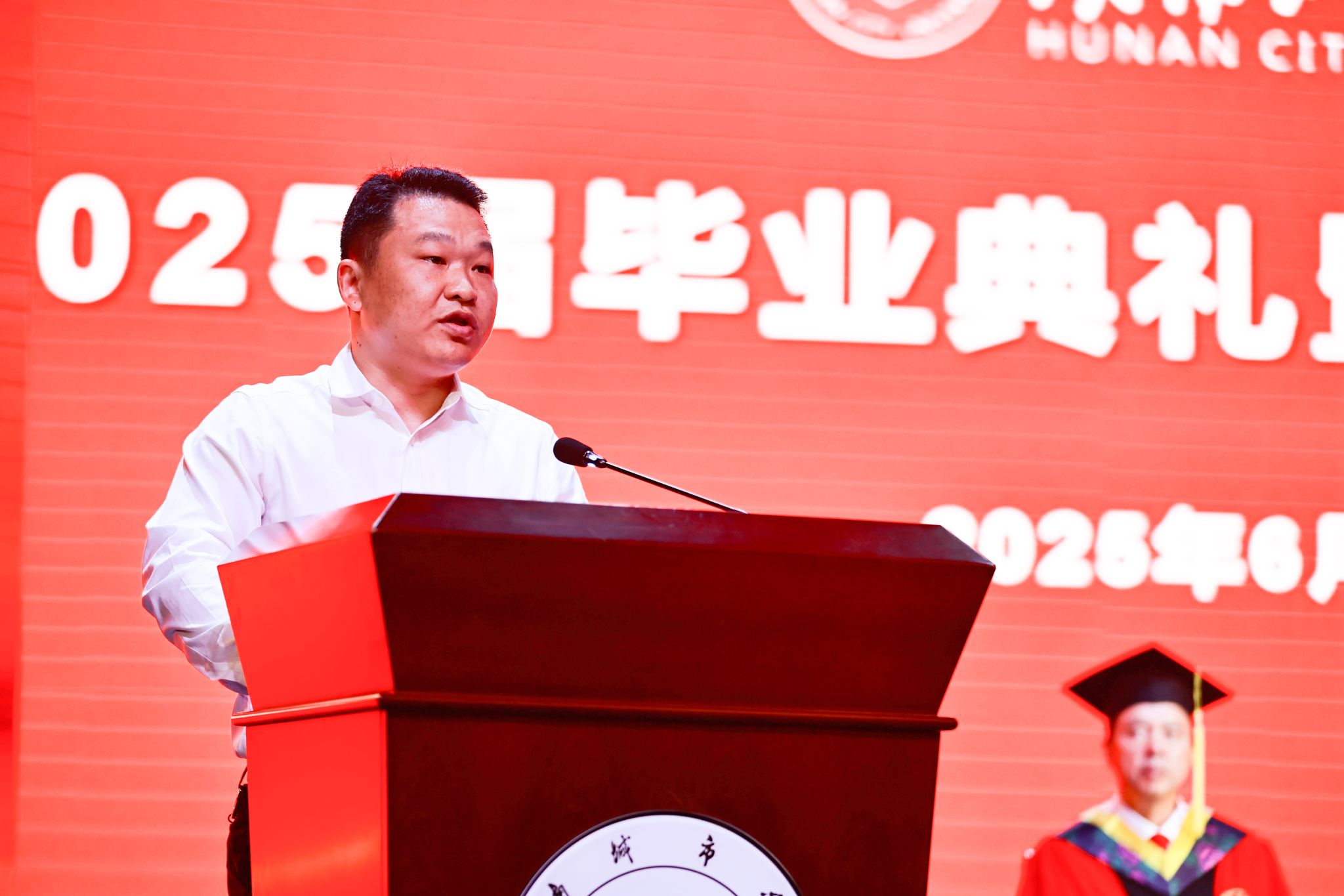 “同学们即将挥别母校,奔赴下一段人生旅程,面对未来,希望大家要深耕自己,勇于破圈,绽放最美青春。”校长何振代表学校为全体毕业生送上最真诚的祝福,他以“撬动未来从‘破圈’开始”为题,从四个方面对即将开启人生新征程的毕业生们提出了殷切期望:一是直面未来,要尽快摆脱“救济圈”。要做赚钱的能手,要做养家的巧手,要做立业的强手,毕业了要主动拒绝父母的救济,建好自己的粮草库,赚取人生的“第一桶金”;二是赢得未来,要主动跳出“舒适圈”。要放下架子学,要撸起袖子干,要扑下身子做,青年大学生身上不仅要有书香味、文艺范,还要有泥土气、烟火味,扎根基层一线,淬炼火热青春;三是掌握未来,要果敢摘下“金箍圈”。要相信命由己造,要践行德由己修,要坚持福由己求,幸福有时是做加法,有时又要做减法,但绝不会从天而降,更不能靠他人施舍,需要凭自身的努力与追求。四是享受未来,要清醒抵御“围猎圈”。不生“不法心”,不沾“不义财”,不踏“不归路”,同学们目前涉世未深、资历尚浅,不要盲目“开盒”,莫因一念之差坠入贪腐堕落深渊,要守住交往关,净化朋友圈。