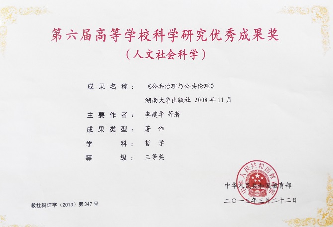 (本网讯)日前,教育部正式公布了第六届高等学校科学研究优秀成果奖(人文社会科学)获奖名单。我校李建华教授著作《公共治理与公共伦理》获得哲学类三等奖,这是我校首次获得教育部高等学校科学研究优秀成果奖,也是今年湖南省二本高校中唯一获奖成果。