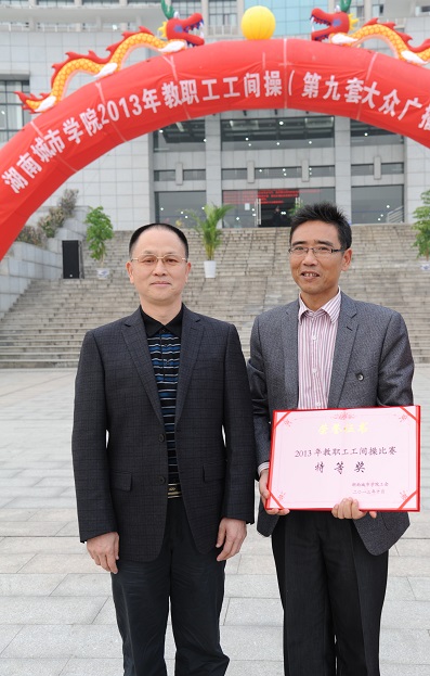 最后,经过由体育学院专业老师组成的裁判组评分,体育学院分工会获得特等奖;离退休教职工代表队获得表演奖;市政与测绘工程学院分工会、建筑与城市规划学院分工会获得一等奖;音乐学院分工会、图书馆分工会、土木工程学院分工会、机关二分工会获得二等奖;校办产业分工会、机关一分工会、机关三分工会、外国语学院分工会、化学与环境工程学院分工会、通信与电子工程学院分工会获得三等奖;唐海欧、李琳、陈燕娇、黄智、李娟、张珊、宋和明获得优秀领操员奖。