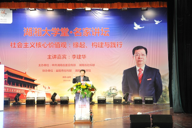 (本网讯) 10 月14 下午,由省委宣传部和省社科联主办的湖湘大学堂·名家讲坛在我校音乐厅隆重举行。长江学者、校长李建华教授主讲,他以“社会主义核心价值观的缘起、构建与实施战略为题,与省市社科界专家学者、新闻媒体和500余名师生代表畅谈交流。