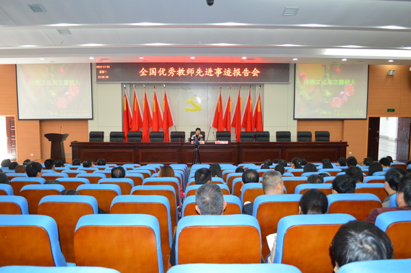 (本网讯)114日下午, “全国优秀教师先进事迹报告会”在图书馆报告厅举行,荣获“全国教书育人楷模”、“全国师德标兵” 、“ 全国百佳 教授”、“湖南省师德标兵”、“我心目中最敬爱的老师”、“长沙市十大最美女性”等多项荣誉称号的湖南大学 胡遂 教授应邀主讲。报告会由校工会、人事处和教务处联合主办,全体校领导、副处以上干部、各分工会干部、各二级学院教研室主任和一线教师代表等300多人参加报告会,党委书记李建华主持报告会。