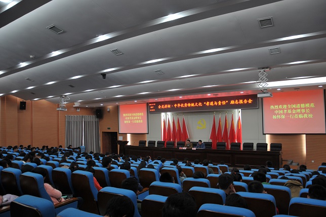 (本网讯) 1118下午,会龙讲坛之全国道德模范励志报告会在图书馆报告厅举行,特邀全国首届道德模范、中国孝基金理事长杨怀保为300余名青年学生代表作了题为“孝道与责任”的 励志报告,报告会由党委宣传统战部会同科技处、学生处、团委和市政与测绘工程学院等单位联合举办。