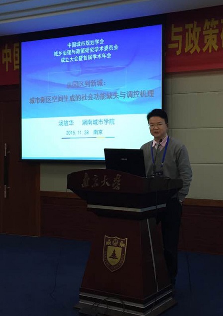 会上, 汤放华 教授当选中国城市规划学会城乡治理与政策研究学术委员会副主任,并在成立大会上作主题报告。围绕“新城新区:中国城市空间的生长与治理”会议主题,汤放华以“从园区到新城:城市新区空间生成的社会功能缺失与调控机理”为题作了主题报告,获得在场领导与专家的热烈反响与高度认同。(科技处)