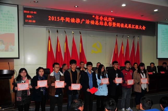 图书馆馆长李教明全面介绍了2015年的阅读推广活动工作情况。学生处处长龙文宣读了“书香城院”2015年阅读推广活动表彰名单。文学院、化学与环境工程学院、商学院、体育学院、音乐学院获得阅读推广活动组织奖;音乐学院和数学与计算科学学院获创新奖;李教明和向春霞分别获教师奖一、二等奖;文学院张情琴、黄婷玉和数计院刘文晶获学生特等奖,文学院张叶等十名学生获“阅读之星”文科组前十名奖,建筑与城市规划学院林业达等十名学生获“阅读之星”理科组前十名奖;音乐学院常学俊获总结表彰大会上的诗歌美文朗诵一等奖。