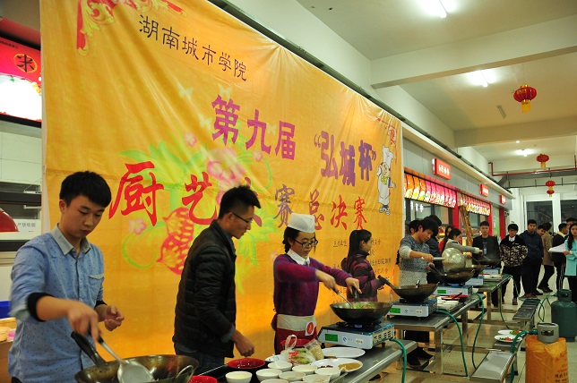 (本网讯)12 月9 日晚 ,由学校团委、后勤处主办,学生维权部、学生伙食管理委员会承办的第九届“弘城杯”厨艺大赛总决赛在第二餐饮中心二楼举办。来自各二级学院的18支队伍参加了比赛。厨师代表、教职工代表、离退休教师代表以及学生代表担任本次大赛的评委。