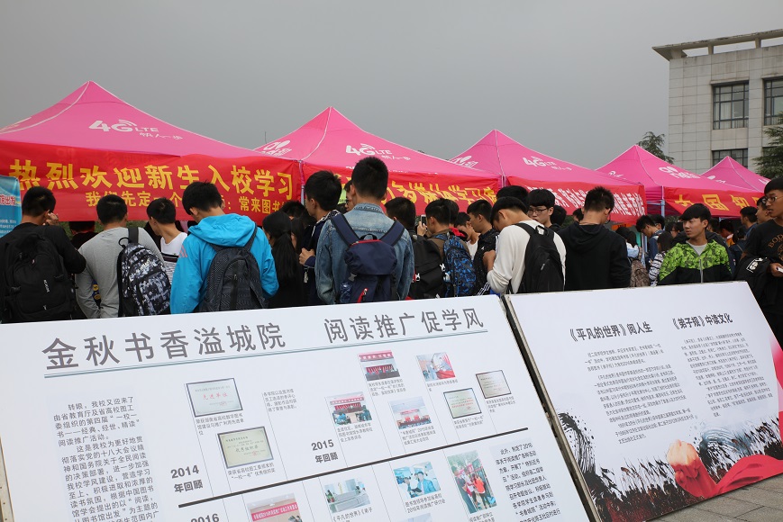 (本网讯)为响应省教育厅及省高校图工委关于在高校举办第四届“一校一书——经典、经世、精读”阅读推广活动的号召,进一步加强我校学风建设,营造学习至上、积极进取和浓厚的读书氛围,图书馆与教务处、学生处、校团委、宣传部、党政办于近日联合组织开展了“金秋书香溢城院”主题活动,在全校师生范围内广泛开展阅读推广。