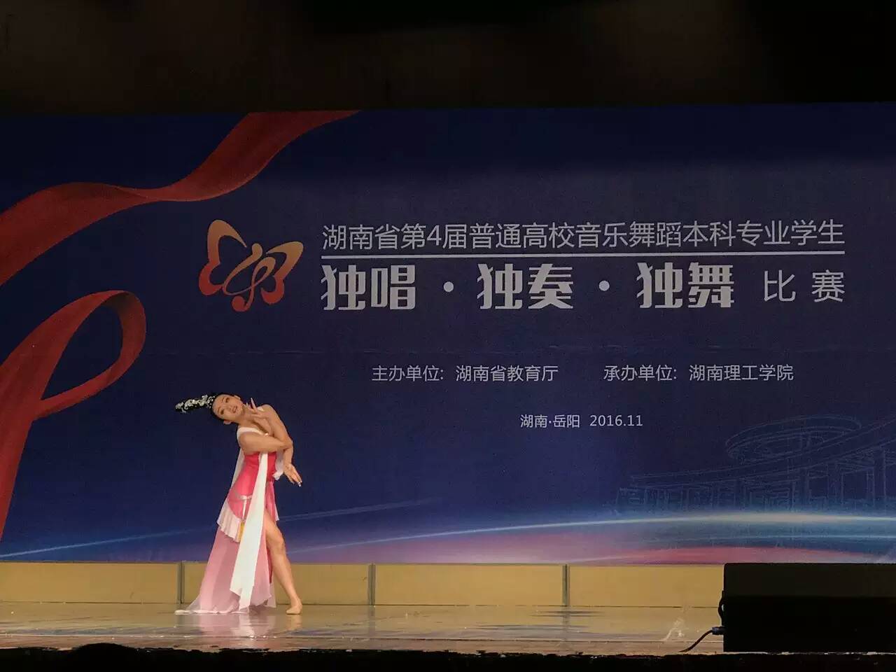 本次比赛由湖南省教育厅主办,湖南理工学院承办,来自湖南省22所高校参加了此次比赛。我校音乐学院共九名学生参赛,其中声乐类、舞蹈类、器乐类各三人,一等奖获得者分别是独唱类(美声、通俗)李君煜、李燕妮,独奏类(钢琴)陈桓,独舞类(古典舞)莫亚男,独舞类(现代舞)熊羽清。音乐学院梁玲芝、曹蕙姿、彭云、李翃旻、赵婷、宋和明、张瑞智、袁丽老师均获优秀指导教师奖。