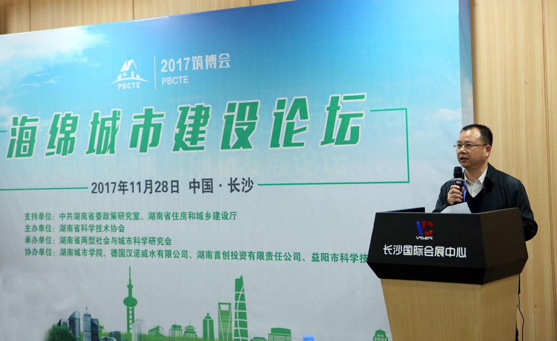 (本网讯)11月28日至30日,2017湖南(长沙)装配式建筑与建筑工程技术博览会(简称“筑博会”)在长沙召开。作为大会6个分论坛之一,由湖南省两型社会与城市科学研究会承办,我校协办的海绵城市建设论坛于28日在长沙国际会展中心隆重举行。湖南省长株潭两型试验区工委委员、管委会副主任刘怀德,湖南省住房和城乡建设厅副巡视员易小林,校长李建奇、副校长谭献良,以及协会常务理事、理事、会员代表,省直有关部门的领导、有关高等院校、相关企业单位的领导、嘉宾出席论坛会议。我校教务处、科技处、土木工程学院、市政与测绘工程学院有关人员全程参观展览和论坛。