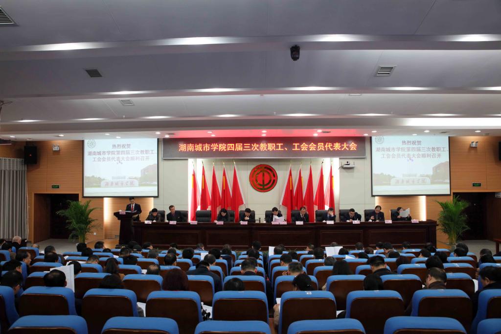 (本网讯)3月24日上午9点,我校第四届三次教职工、工会会员代表大会在图书馆报告厅隆重召开。139名正式代表、特邀代表和列席代表出席会议。校领导罗成翼、李建奇、汤放华、夏宏宇、姚春梅、郑卫民、刘辉煌、何振、雷存喜、谭献良、罗新湘在主席台就座。大会由党委书记罗成翼主持。