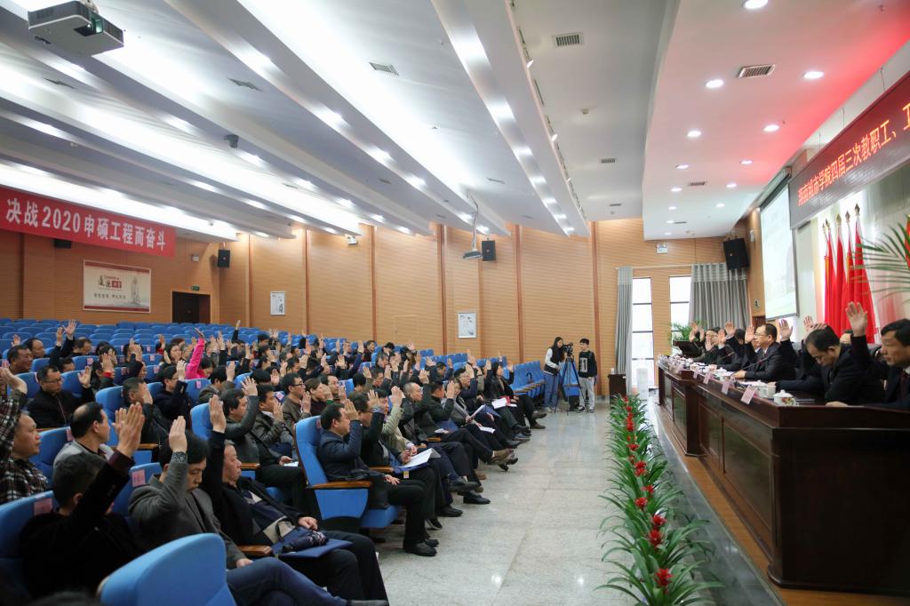 (本网讯)3月24日下午4点30分,我校第四届三次教职工、工会会员代表大会闭幕式在图书馆报告厅举行。会议审议通过了校长工作、工会工作、财务工作、工会经审工作等报告。党委书记罗成翼在会上作重要讲话。会议由校长李建奇主持。