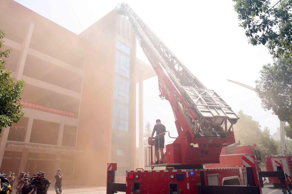 中午12:20,火灾应急疏散逃生演练正式开始。随着一声哨响,工作人员在第二教学楼内点燃了烟雾弹。不一会儿,滚滚浓烟充斥着楼道,随后刺耳的消防警报声响起。5000余名新生用随身携带的湿毛巾捂住口鼻,在义务消防员的指引下低姿势快速撤离“起火”建筑物,迅速撤离至应急避难场所。与此同时,搜救队分层对被困人员进行了搜救,益阳市公安消防特警大队消防救援车辆也赶到现场,利用水枪开展灭火作业,并依靠登高消防车对高处被困人员进行营救。