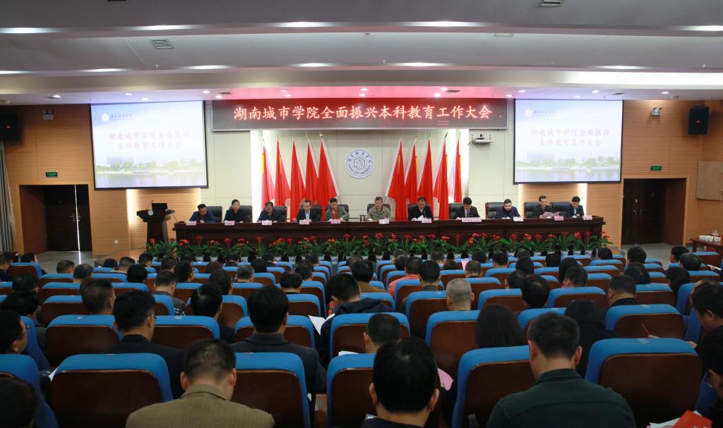 (本网讯)为进一步落实全国教育大会与新时代全国高等学校本科教育工作会议精神,全面提高学校本科教育水平和人才培养能力,研究部署本科人才培养工作,2019年4月12日,我校全面振兴本科教育工作大会在图书馆报告厅举行。在家的校领导,副处级以上干部、督导团团长、教学科研办主任、系(室、中心)主任,教务处、教学质量监控与评估中心全体成员,全体辅导员、二级学院教师及学生代表共270余人参加会议。会议由学校党委副书记汤放华主持。