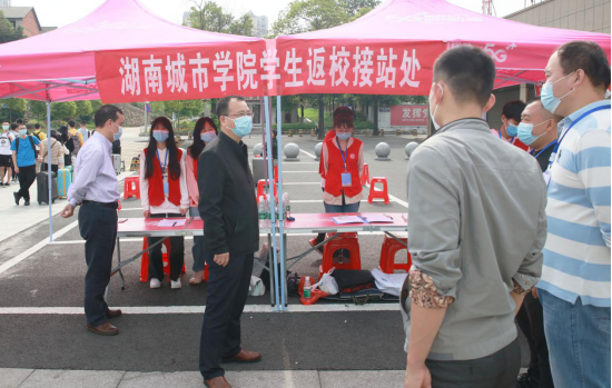 南门广场入校指定报到点,当日上午7:30,佩戴口罩、手持额温枪的工作人员严阵以待,正式迎接返校学生。除益阳本地学生乘坐私家车和公共交通工具返校外,学校特意安排专车前往益阳汽车东站、汽车北站和火车站(含朝阳汽车站)迎接返校学生,以减少途中配载,严防交叉感染。