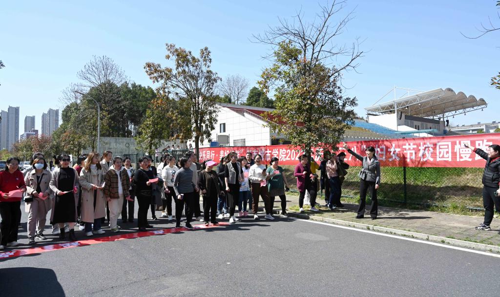本网讯(通讯员 周敏)为庆祝第112个 “三八”国际妇女节,激励广大女教职工以更加饱满的激情在教书育人的岗位上建功立业,3月8日下午,我校举行“快乐同行•美好相伴”庆“三八”国际劳动妇女节校园慢跑+知识竞答活动。全校有近500名女教职工参加了此次活动,党委副书记何旭娟来到现场慰问女教职工,并为第一组参赛选手发令开始比赛。