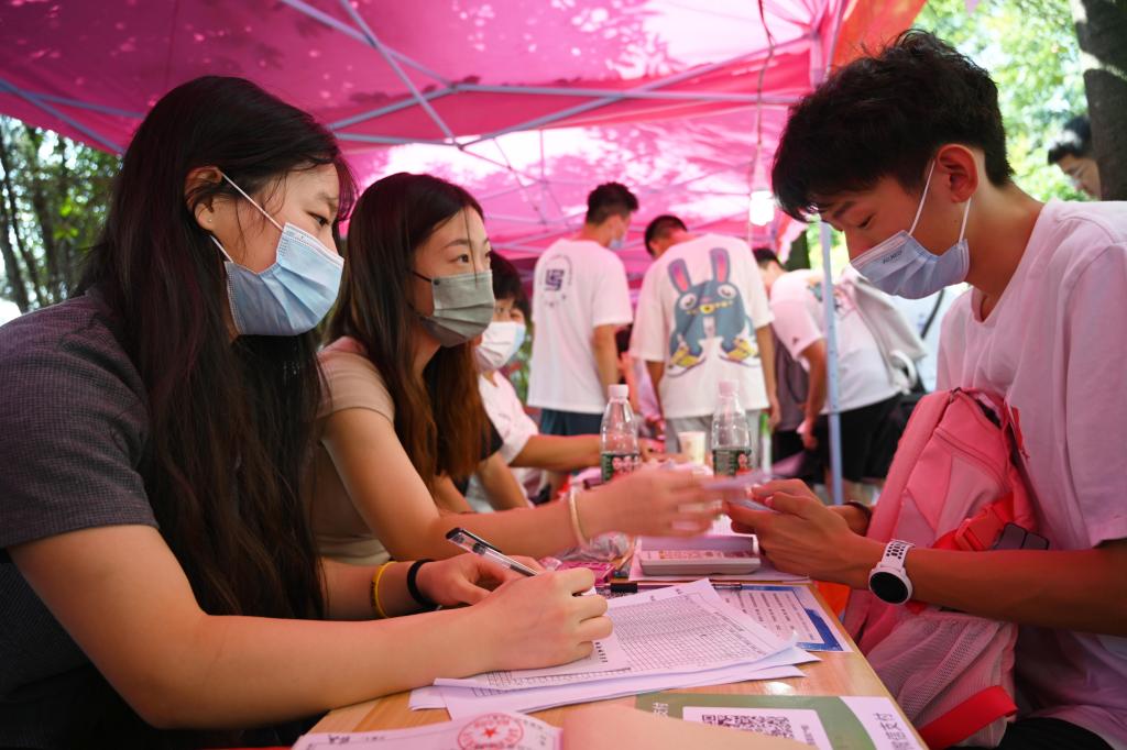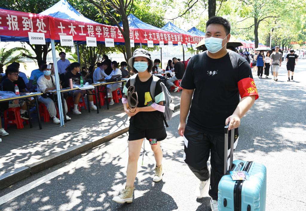 早上8点不到,学校校门口就已是人潮涌动。扫场所码、测量体温、查验健康码行程码、出示48小时内核酸检测阴性证明和录取通知书……在学校东、南、西、北四个校门处,“新橙子”们间隔1米排着长队,从临时搭建的报到通道中依次进入校园,并在志愿者的引导和帮助下前往迎新报到处。