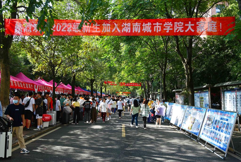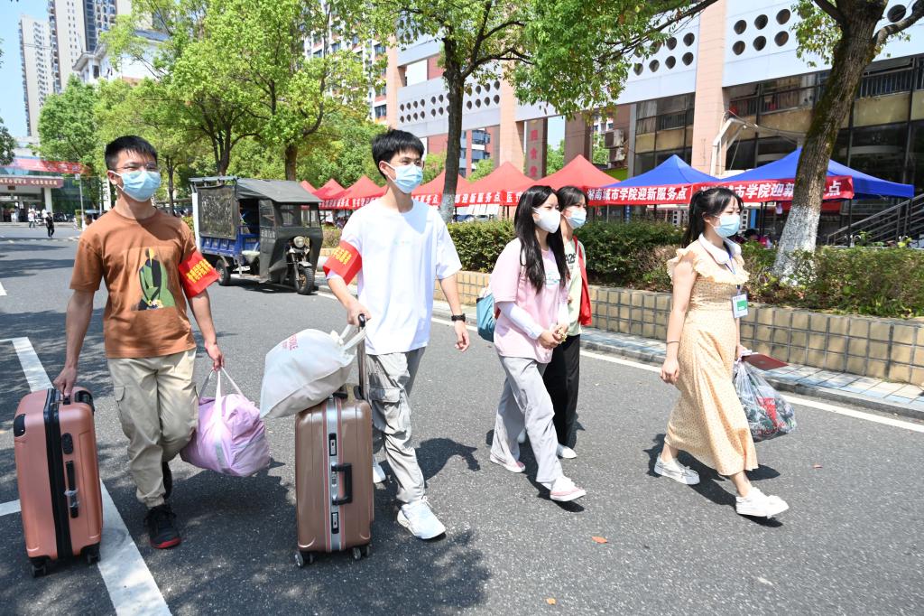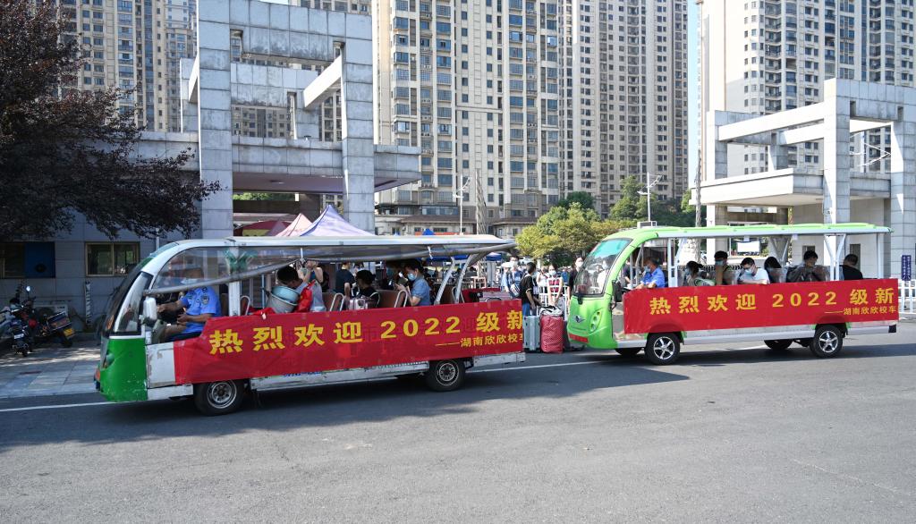 满载着新生和行李的电瓶车往复行驶在校门与迎新点之间。