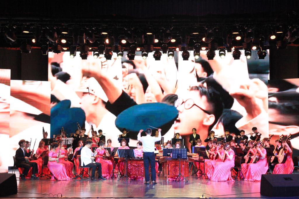 大合唱《愿》拉开了音乐会的序幕。《黄河颂》《光明行》《我爱你中国》《多想对你说》等众多耳熟能详的经典曲目悉数登场。音乐会紧扣中国共产党百年党史,共分为“星星之火”“峥嵘岁月”“滚滚春潮”“广阔前程”四个篇章,学院教师们精心选取了16首红色经典曲目,以器乐合奏、歌曲演唱、舞蹈表演、情景歌剧等多种形式,回望波澜壮阔的百年征程,重温热血澎湃的峥嵘岁月,展望奋发有为的新时代。一首首经典曲目、一个个精彩表演深刻诠释了中国共产党人的初心和使命。