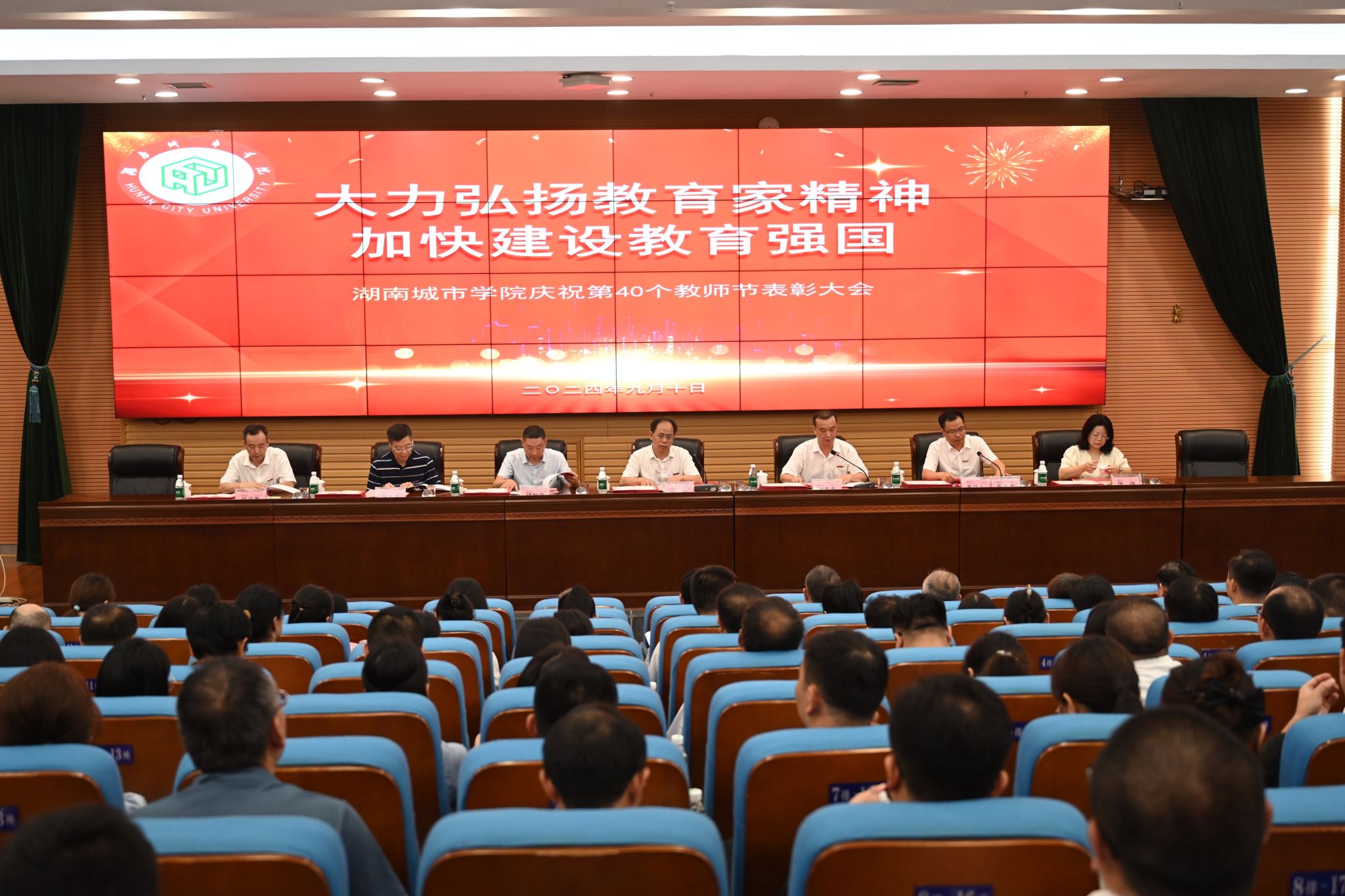副校长雷存喜宣读了2023-2024学年获得的奖励成果业绩,2023年度单位目标管理考核先进集体及单项奖,2024年“师德先进个人”名单和第40个教师节先进人物(团队)名单。
