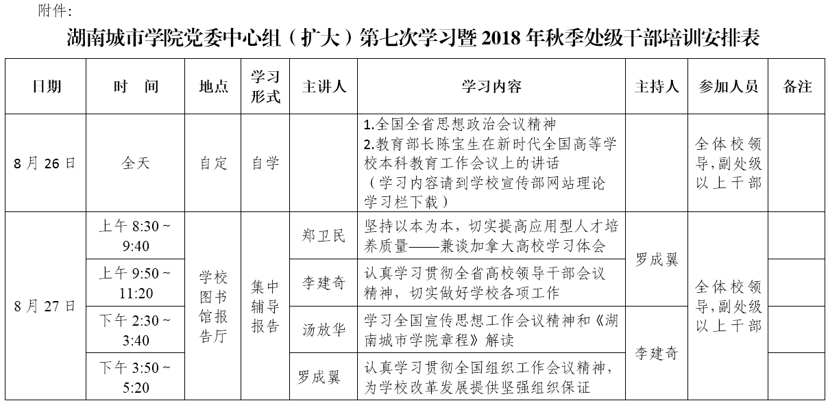 为加强干部教育培训工作,增强干部的责任感和使命感,提高干部的专业能力和专业精神,进一步推动学校改革发展,学校党委决定开展党委中心组(扩大)第七次学习暨2018年秋季处级干部培训,现将有关事宜通知如下。