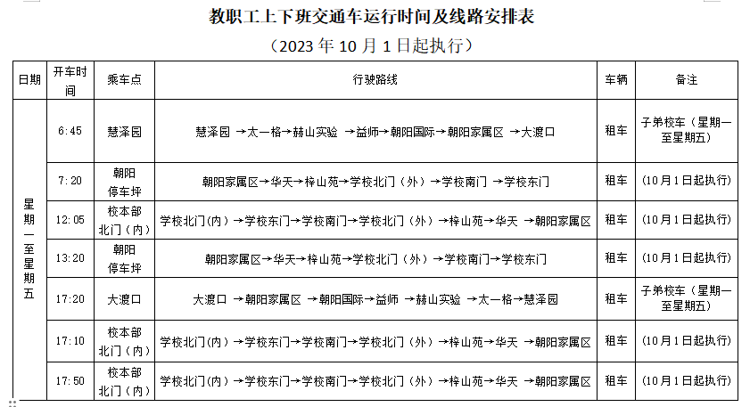 2.教职工上下班交通车运行时间及线路安排表(冬令时)