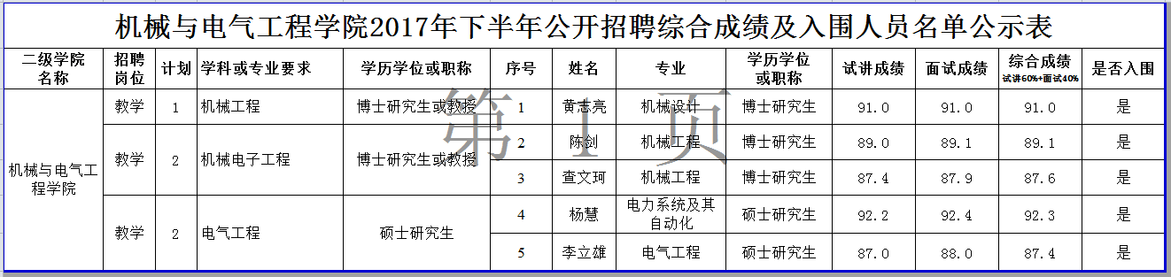 机械与电气工程学院2017年下半年公开招聘综合成绩及入围人员名单公示表
