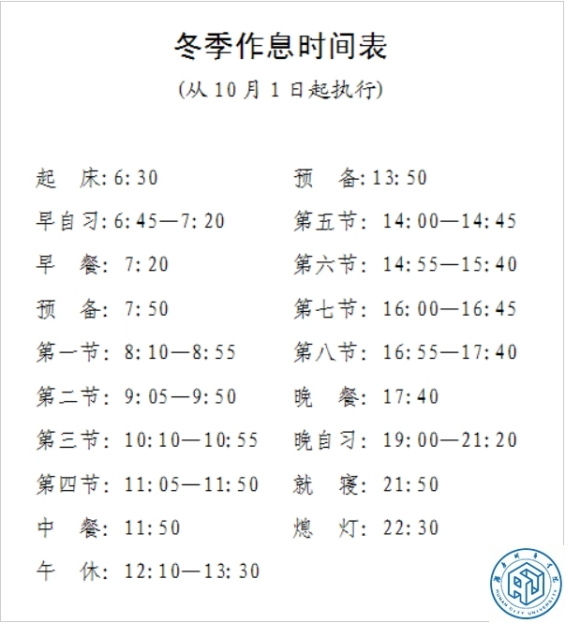10月1日起,学校执行冬季作息时间。