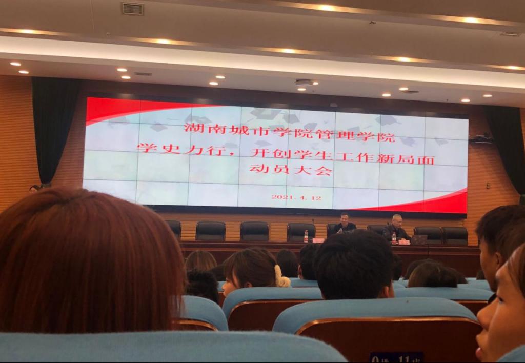 【党史学习教育】为使我校《中共米兰体育·米兰官方网站关于开展党史学习教育的实施方案》落到实处,提高管理学院团学干部的政治自觉,树立正确党史观,扎实做好团学工作,4月12日晚7点,管理学院在图书馆报告厅召开了“学史力行,开创学生工作新局面”动员大会,管理学院党委书记徐习军、党委副书记王润华以及全体辅导员、团学干部和部分党员代表参与了本次大会,本次会议由组织员阳红珍主持。