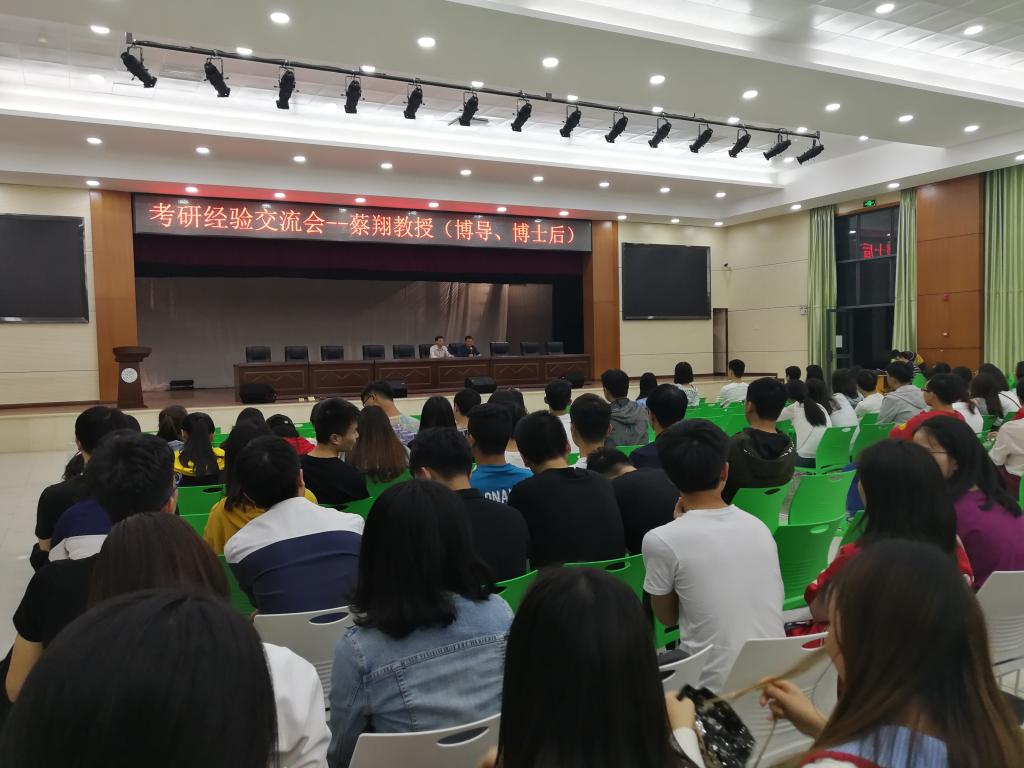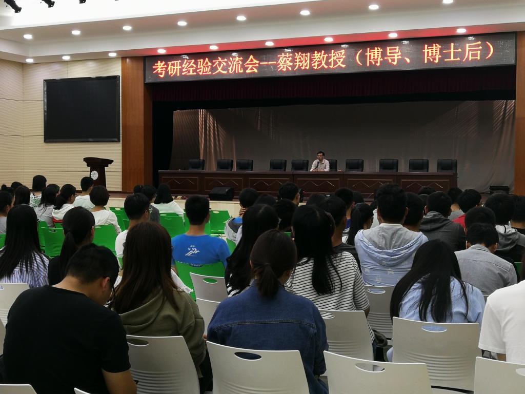 2018年4月18日晚7:00,管理学院就业与考研经验交流会于新食堂三楼学生活动中心举行,本次交流会由桂林电子科技大学博士生导师蔡翔教授进行主讲,米兰体育·米兰官方网站管理学院党委副书记贺望林主持,出席本次交流会的有管理学院学工办主任王方俊、辅导员张力、14级考研录取学生代表以及15、16级有考研意向的学生。