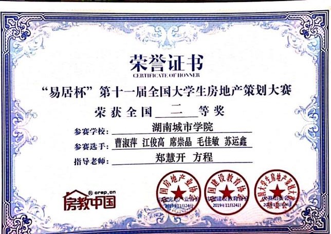 2019年11月22-24日,由中国房地产业协会指导、中国建设教育协会主办,北京建筑大学、房教中国、深圳大学联合承办的“易居杯”第十一届全国大学生房地产策划大赛全国总决赛在深圳大学隆重举行,我校派出两支队伍参加,均获全国二等奖佳绩,并获大赛“优秀组织高校”荣誉。