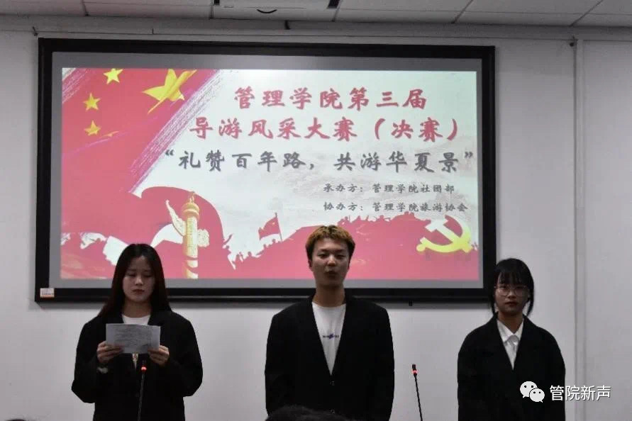 为庆祝中国共产主义青年团建团100周年,增加同学们对红色文化的了解,充实校园生活。管理学院于2022年5月19日晚19时30分在管理楼504会议室举行第三届以“礼赞百年路,共游华夏景"为主题的导游风采大赛。本次活动由管理学院活动部主办,管理学院旅游协会协办,管理学院旅游管理专业的尹罡、刘婷、陈海波、刘文斌、昌晶亮、汪灿老师担任评委。此次比赛加深同学们对于导游风采的理解,使同学们受益颇深。