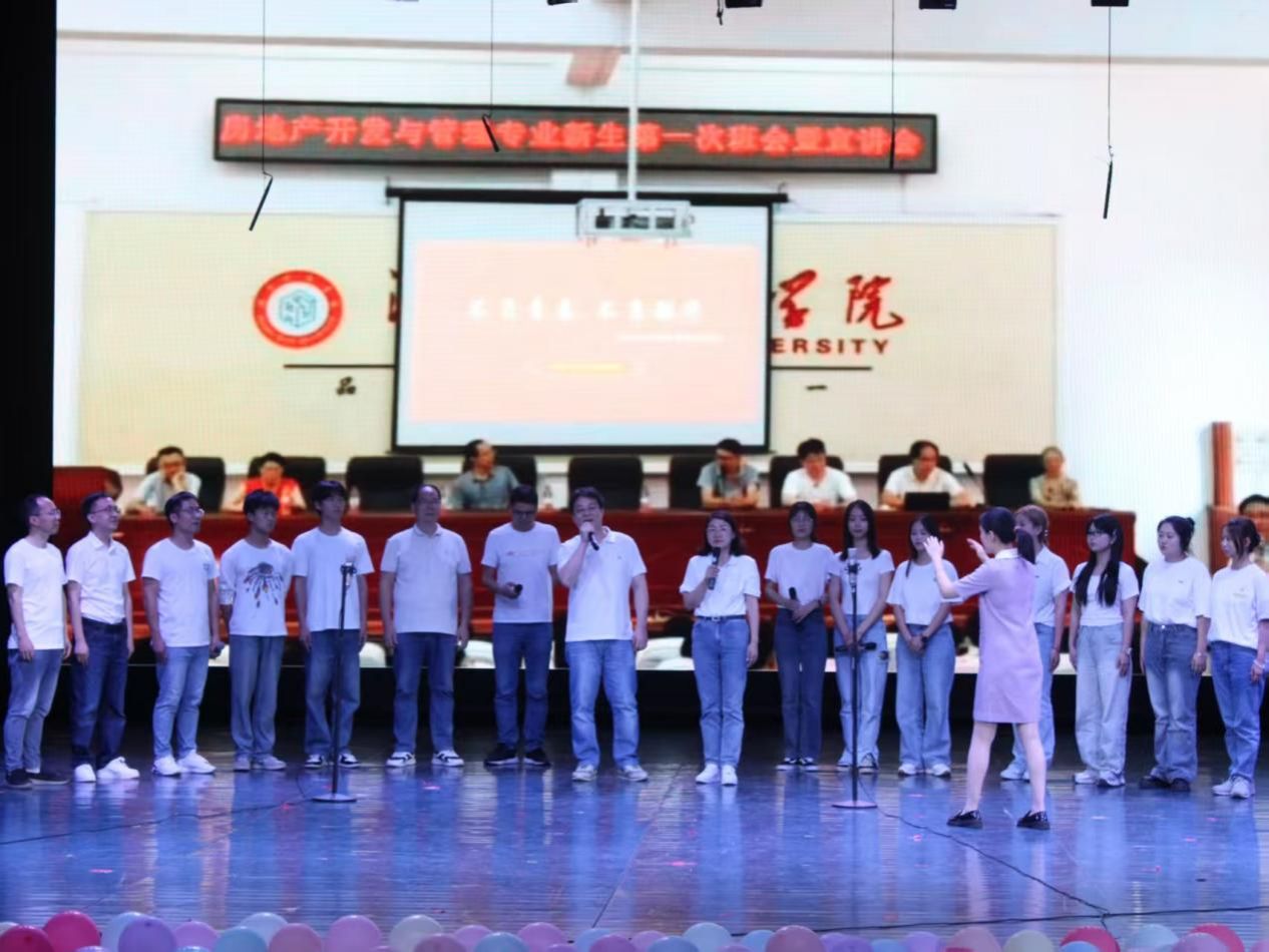 晚会伊始,全体师生庄严肃立,齐唱国歌。王正安书记为晚会致辞,他希望毕业生们持续增强创新意识,保持终身学习的好习惯。教师代表张胜老师、优秀毕业生代表赵瑾瑜也为全体毕业生送上寄语。随后,精彩节目轮番上演。韩舞《whiplash》《Strategy》、中国舞《予君书》以舞蹈的形式展现出青春的魅力与激情。Only plan乐队带来的歌曲串烧,凭借其激昂的旋律和动人的歌声,将对青春的美好记忆留在这个夏天。而房地产教研室的老师们带来的《祝你一路顺风》,以及大合唱《再见》,则用温暖的歌声传递了对毕业生的深切关怀与不舍。此外,小品《当考试还剩15分钟》、情景剧《耿耿于怀》和幕布剧《我怀念的》,则以独特的表演形式,勾起了毕业生们对大学生活的美好回忆。晚会临近尾声,汤勇院长发表毕业赠言,他鼓励毕业生们勇敢走出去,勇于直面挑战。据悉,本次晚会在中场设置了抽奖环节,幸运儿们获得了团学会准备的精美礼品。这一环节为晚会增添了趣味性与互动性,给师生们留下了难忘的欢乐时刻。