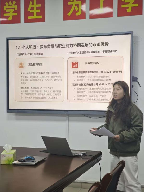 比赛现场,参赛研究生们以精心制作的PPT和逻辑清晰的纸质简历为载体,结合自身专业背景、实践经历与个人特质,从职业目标定位、行业发展认知、阶段实施路径、能力提升计划等方面展开全面阐述,展现出对未来职业发展的深入思考与清晰规划。针对每位选手的展示,评委团老师精准聚焦职业目标与个人特质的匹配度、规划路径的可行性与灵活性、行业认知的深度与广度等核心维度进行提问,并结合管理学科就业趋势与职场核心能力要求,给出兼具针对性与指导性的优化建议,助力选手进一步明晰规划短板、完善发展方案。
