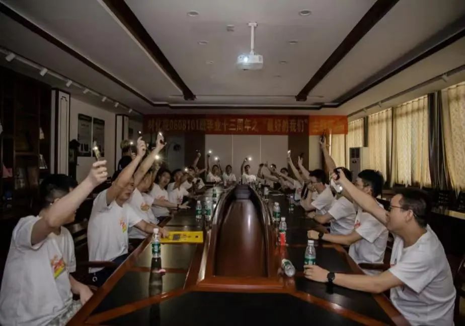 班会结束时,大家合唱了《朋友》、《同桌的你》、《十年》三首歌,高举着手机灯光“荧光棒”身子慢摇起来,进而将活动推向高潮,整个活动充满着温馨浪漫的氛围。